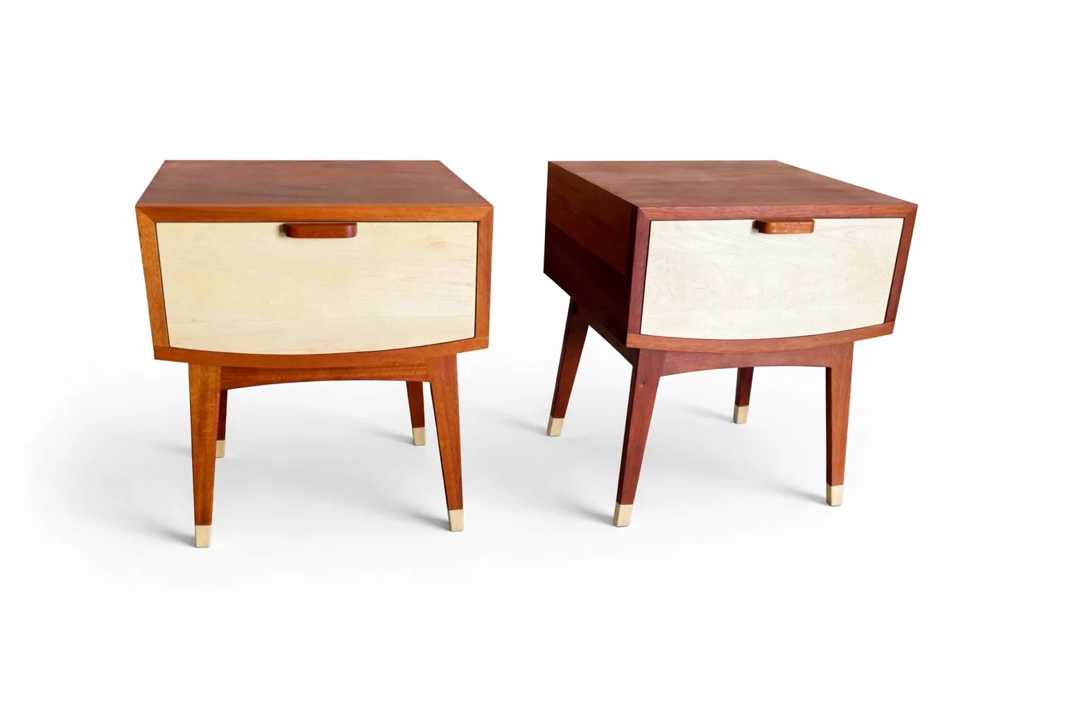 These two new nightstands blend the solid mahogany with the crisp contrast of maple, drawing clear inspiration from classic mid-century modern design while introducing a thoughtful twist. Subtle curves give them a elegant presence, but the standout detail is in the legs—a reimagined take on the iconic brass-tipped taper. Instead of metal, the tapered legs transition seamlessly into maple, creating a subtle yet striking visual accent that feels both fresh and authentic. The result is a pair of nightstands that honor tradition while redefining it. Dimensions are 23” tall, 19” wide, and 16” deep.